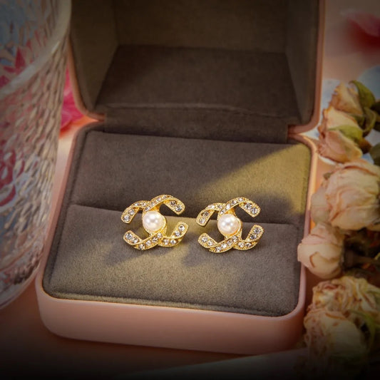 Twisted Double C is for Classy Pearl Rhinestone Earrings, Gold